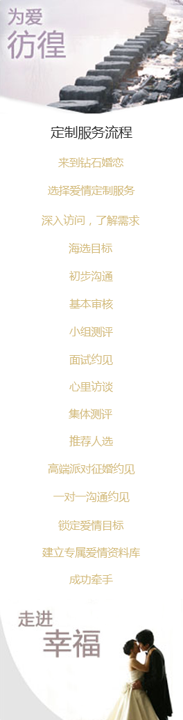 金钱买不到爱情,但可以购买专业服务,提高征婚效率和质量! 钻石婚恋首创的爱情定制服务实现了征婚流程的专业分工、科学配合、流水作业,成为中国第一条专业 征婚流水线。基本审核、内部推荐、初步沟通、小组测评、深入访问、面谈约见、心理访谈、团队测评……各 个部门各个环节紧密配合相互衔接,婚姻猎头团队、婚姻顾问团队不断为客户优化候选人,针对各个目标服务 客户,不符合要求的筛选对象被不断剔除,而合格的入选对象继续进入下一个深入鉴别程序,整个征婚流水线日夜不停的高效率运转,大大提高了征婚的效率和质量。 通过完善的网上和网下双重流水线式的团队合作服务体系,区别于传统婚介的管理无规律性和个人化行为, 克服了普通网上婚恋盲目性、随意性、不确定性强的弊端。